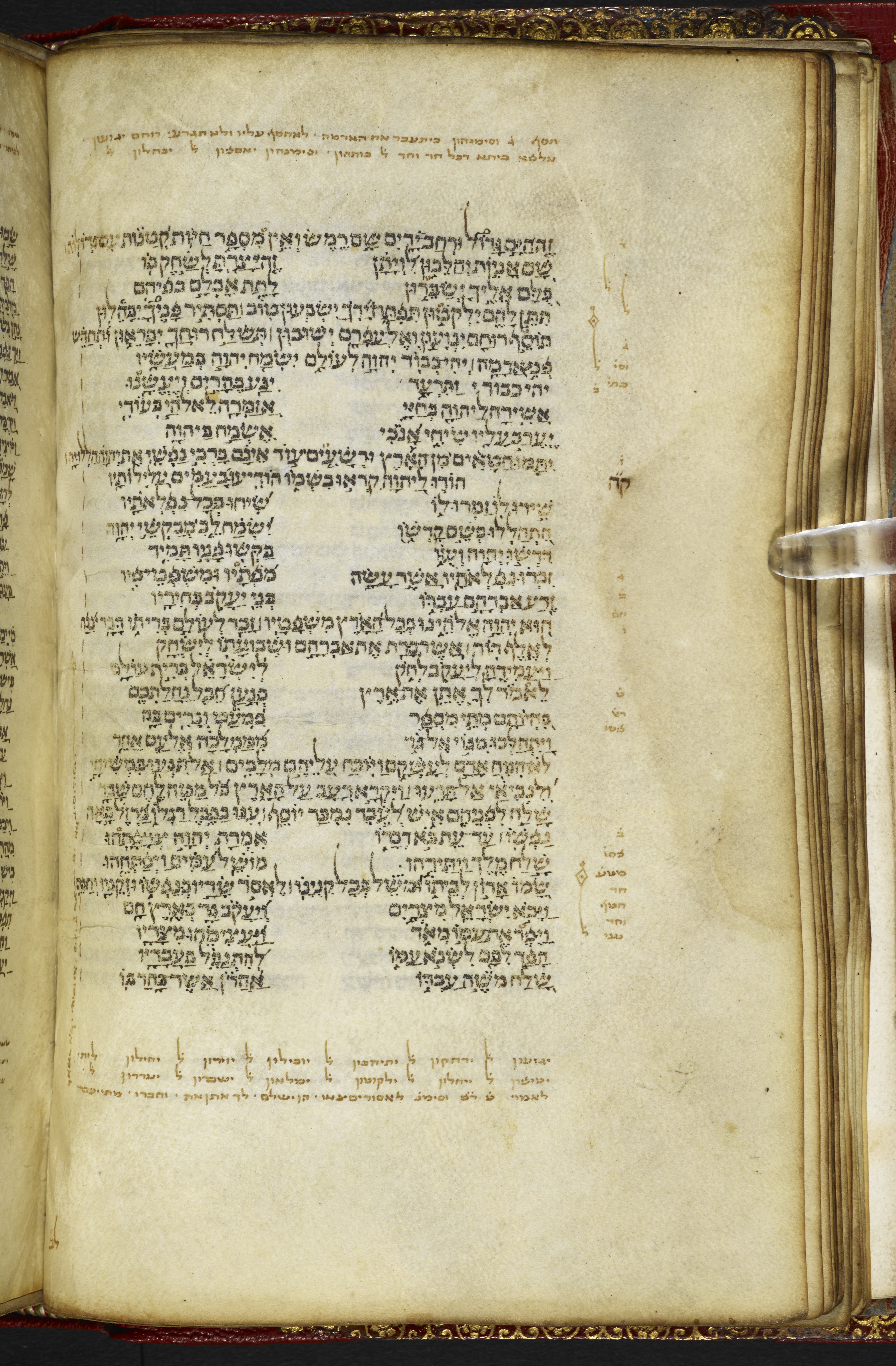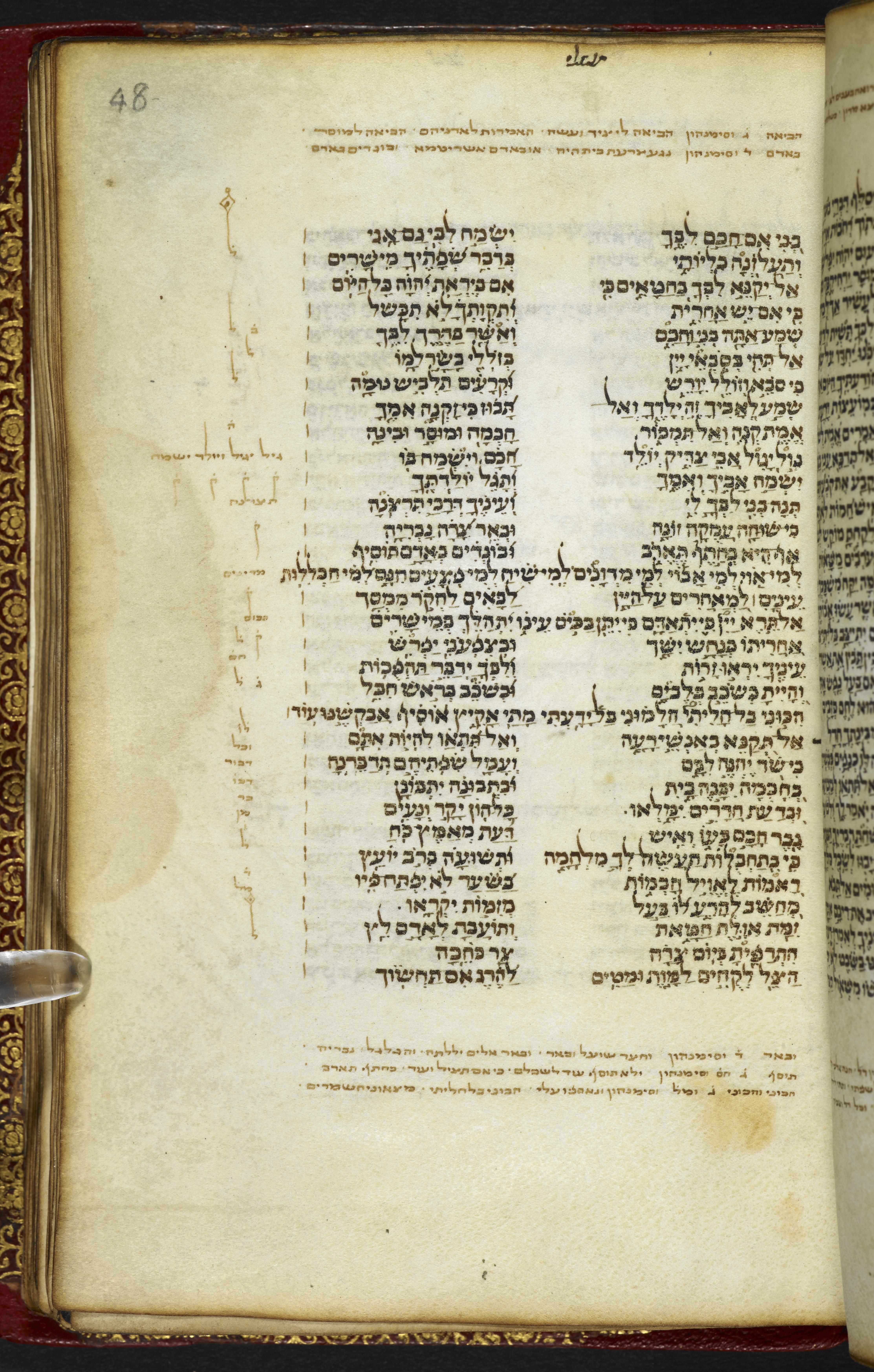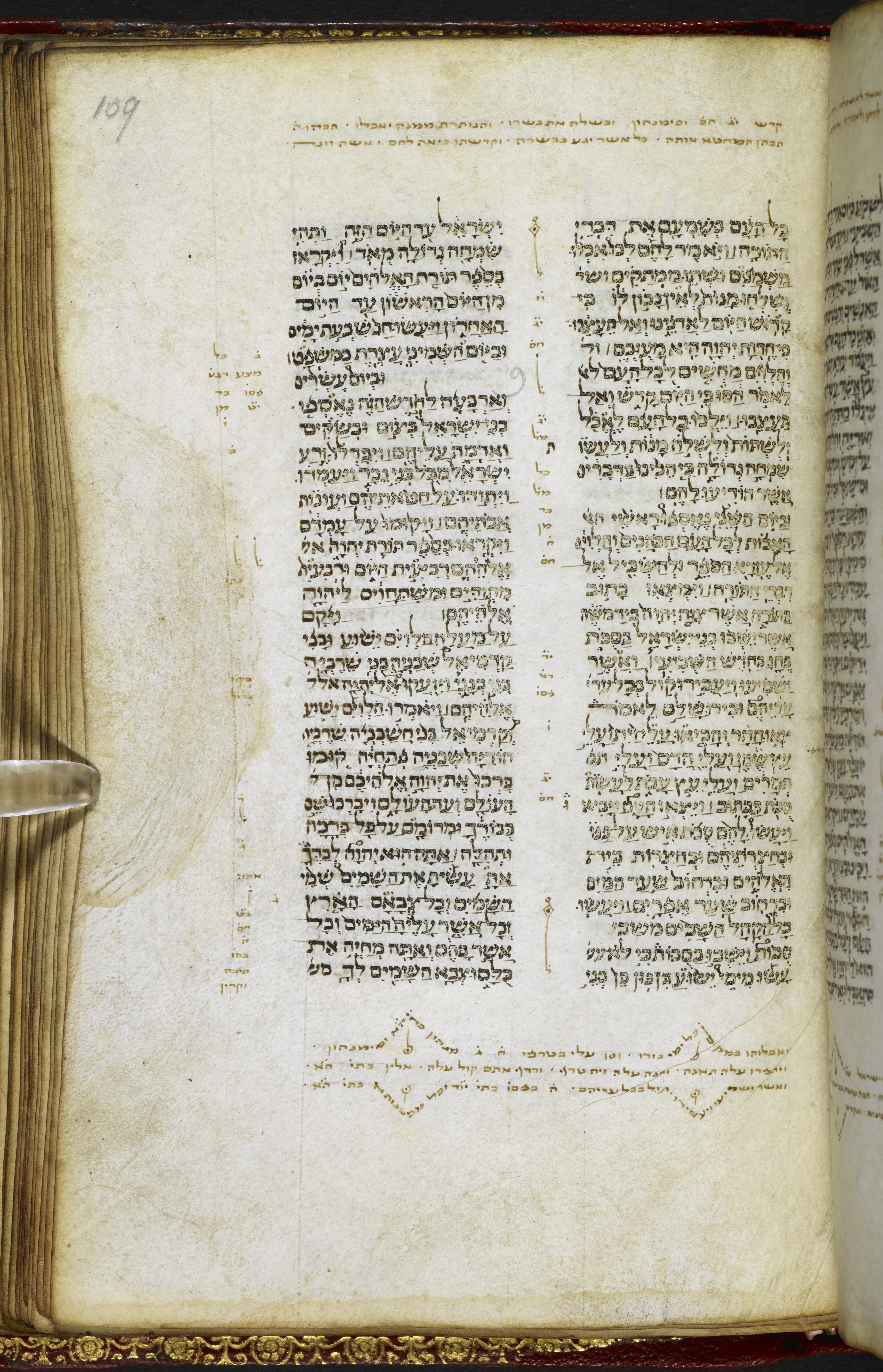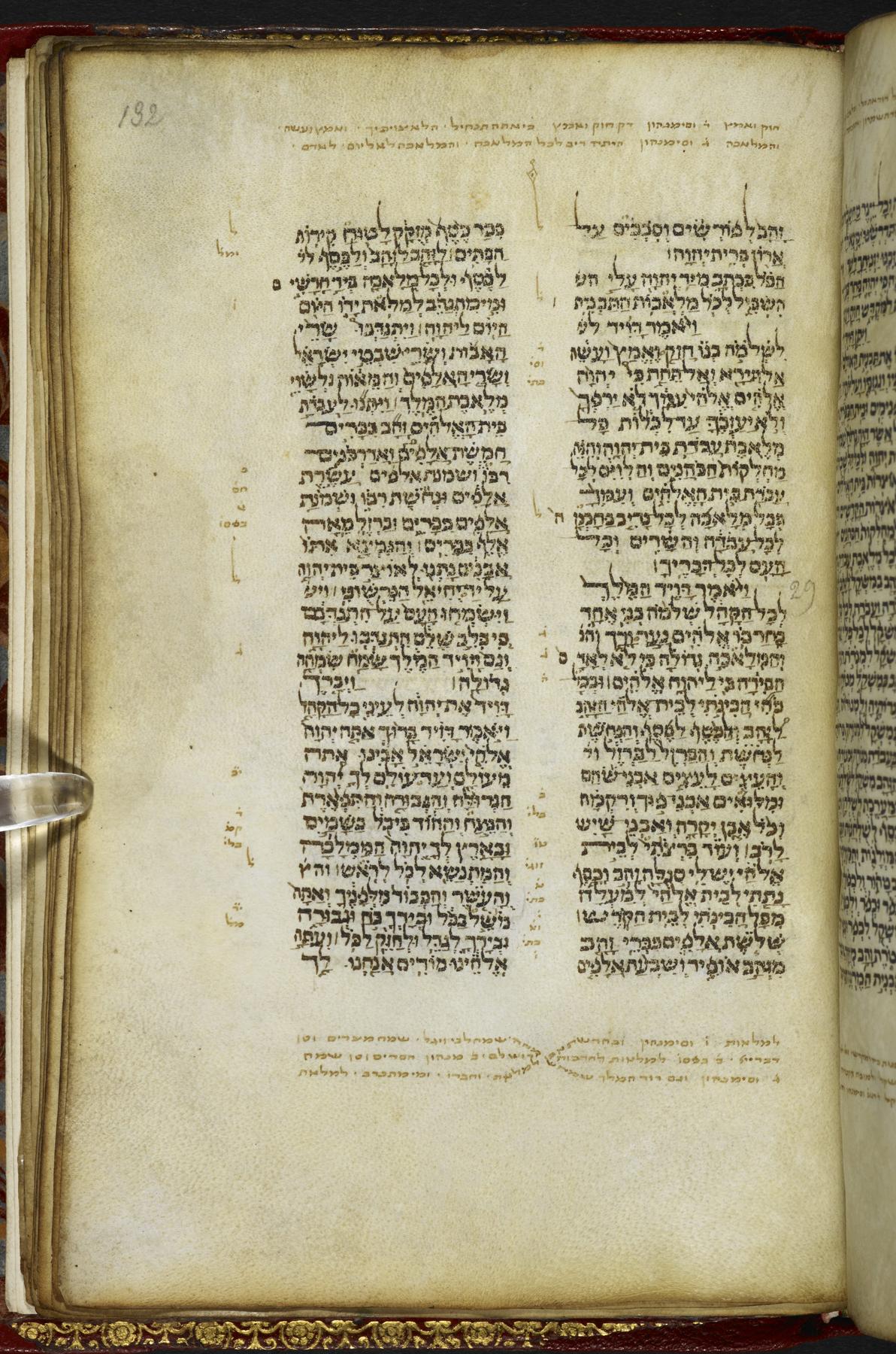 Post-1600 Harleian binding, red leather with gold tooling, marble paper pastedown. Spine: 'Bible IV. Hebrew. Brit. Mus. Harl. Ms. 5498.'Layout