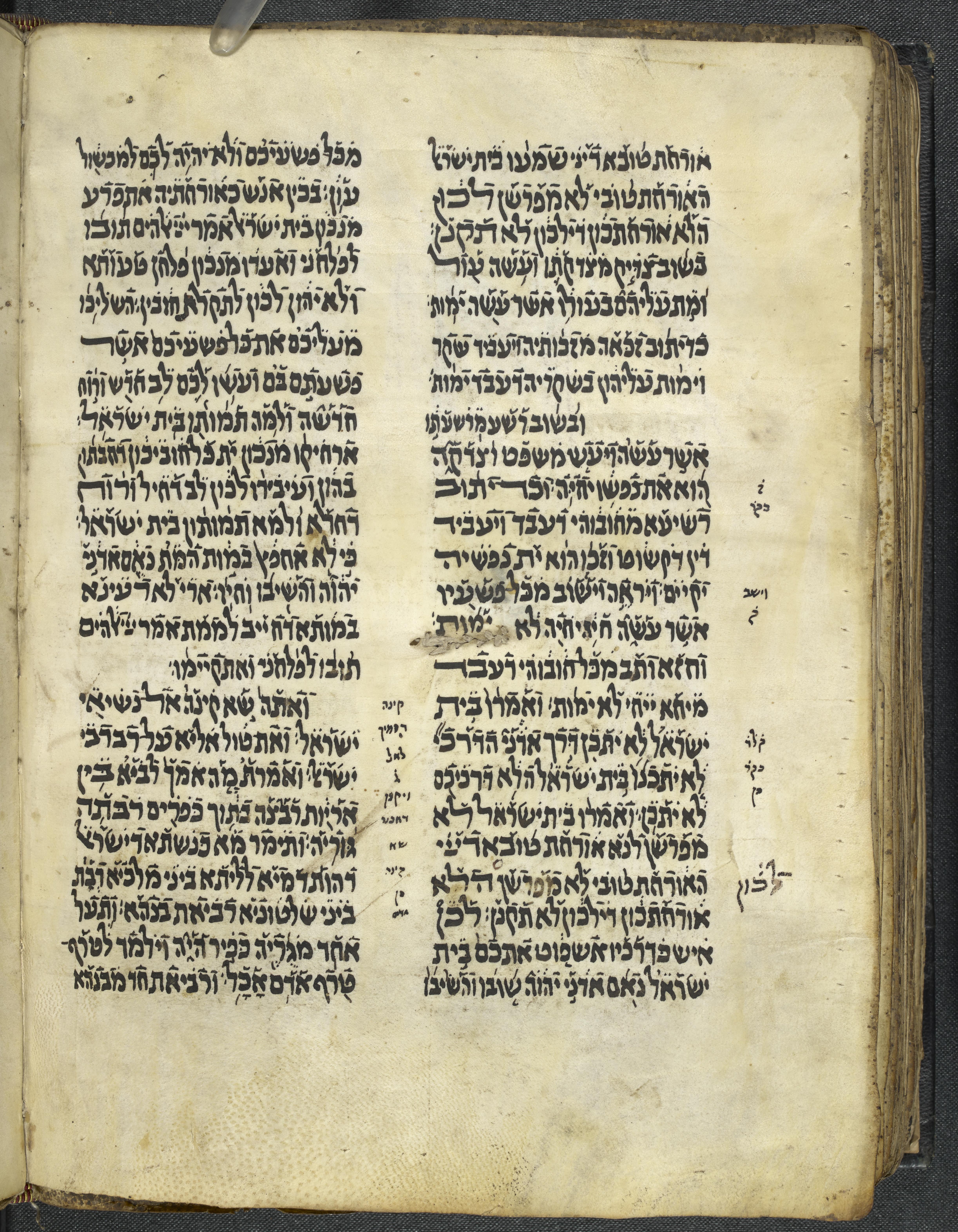 - In the flyleaves at the end, three paper fragments have been added. The first contains a fragment of Judeo-Arabic letter (12th century?); the other two fragments contain Hebrew fragments with superlinear punctuation.