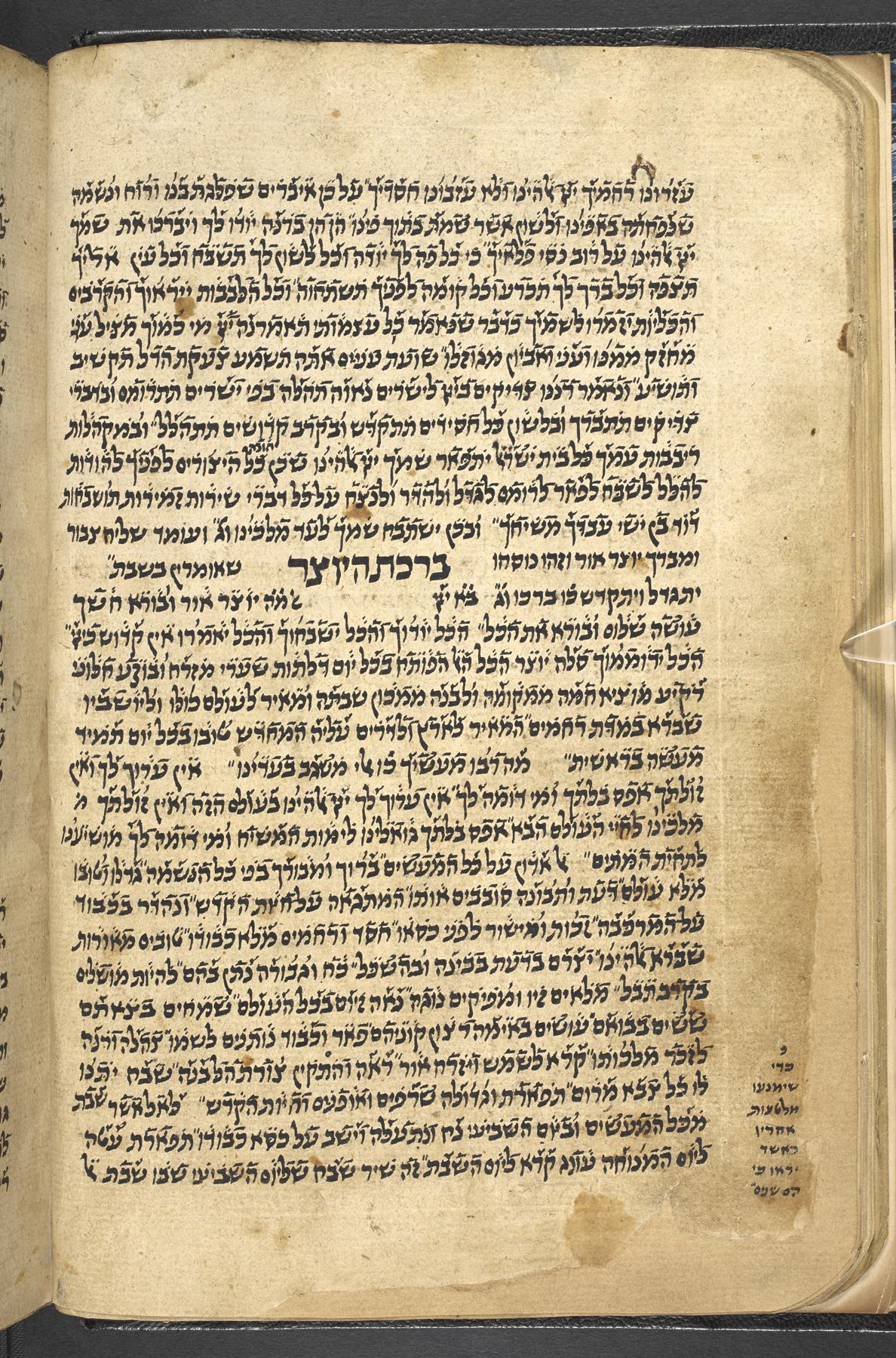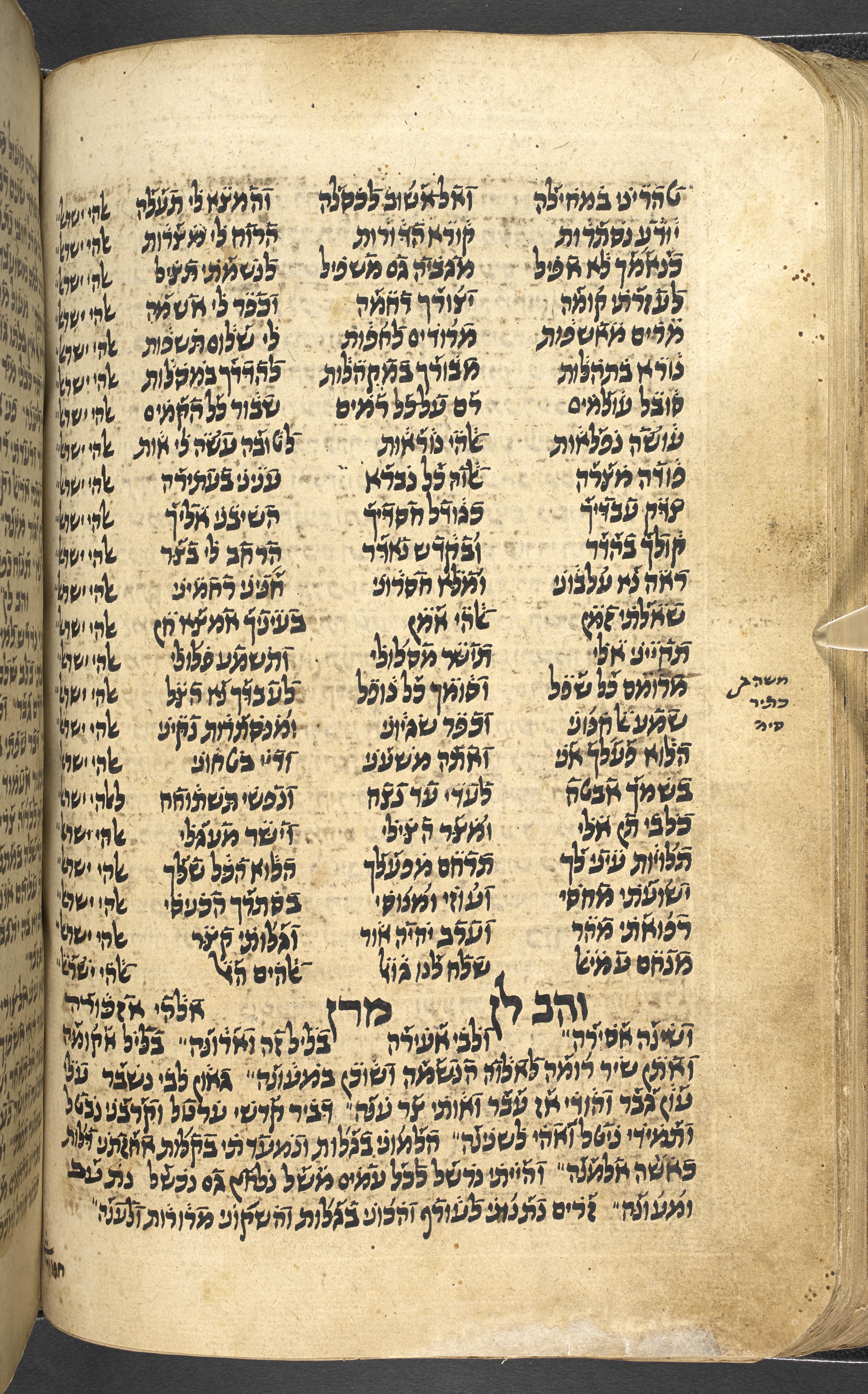 - Appended to the manuscript are the following fragments, originally portions of other manuscripts: folios 195r, 204v - Azharot of Solomon ibn Gabirol, followed by a series of hosh῾anot; folios 205r-211r - Keter malkhut of Solomon ibn Gabirol; folios 211v-212v - two poetical pieces; folio 213 - a calendar leaf on the years 5492-5505 (1732-1745). The first three parts belong most probably to the 17th century.