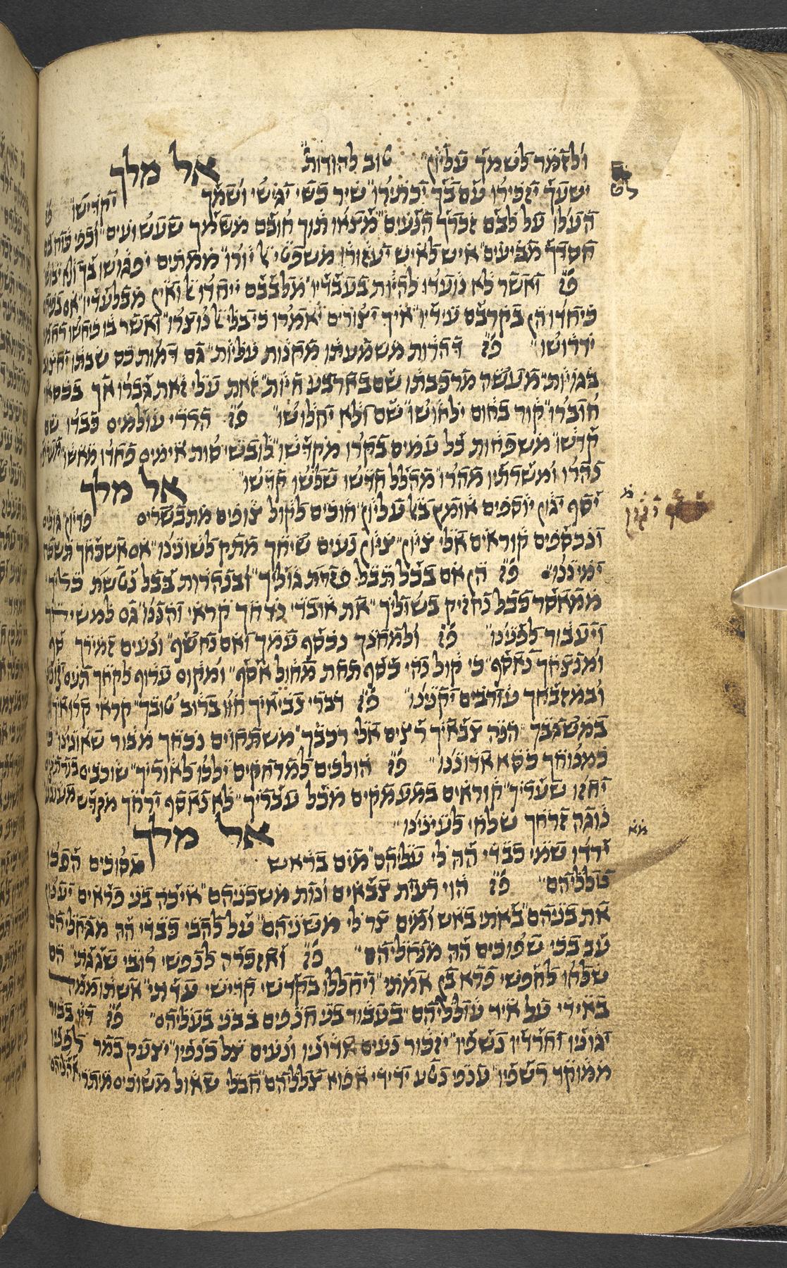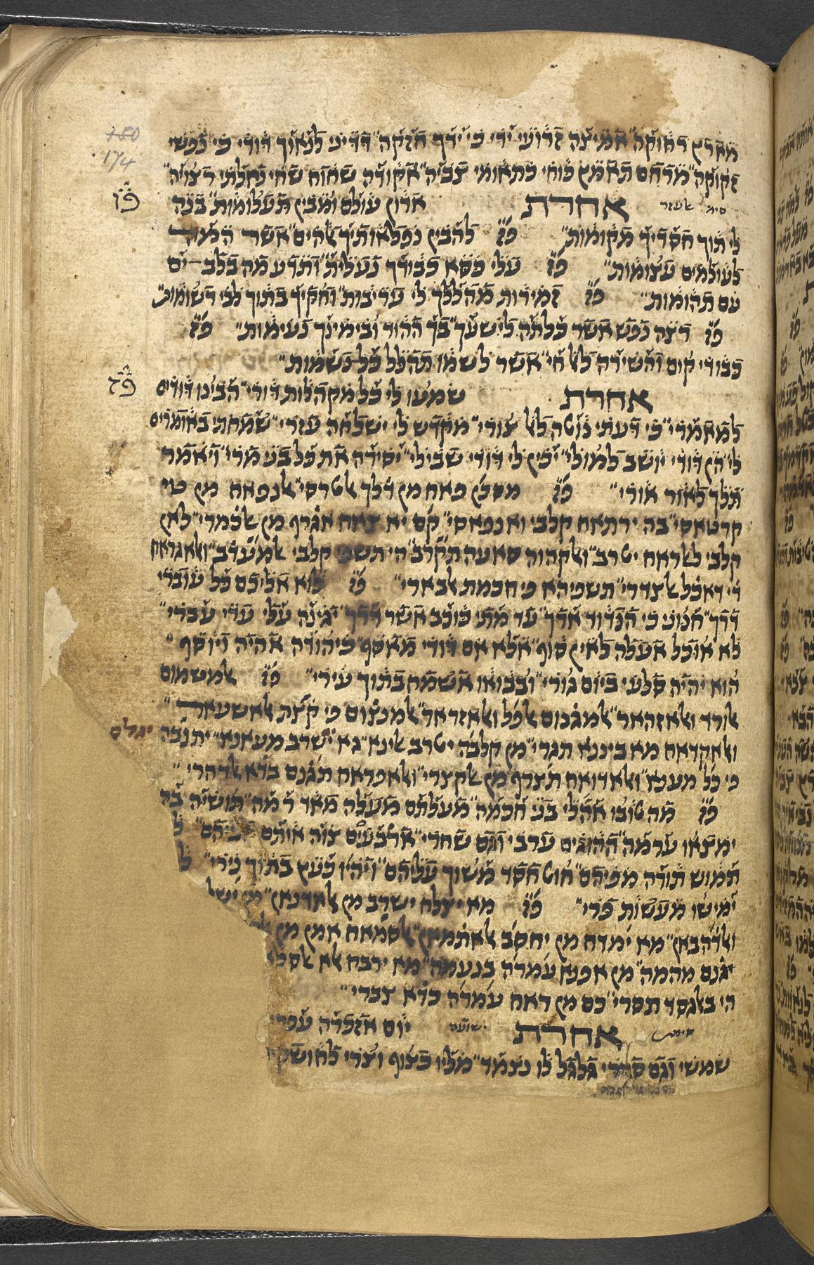 - Folios 44-45, which originally belonged to another manuscript, are now bound with the present manuscript just before shaḥarit of Rosh ha-Shanah. This fragment is also of 17th century. Folio 44r has a note, in a fading ink, of a viduy after the passing of Rabi Yehudah Zeruvavel.