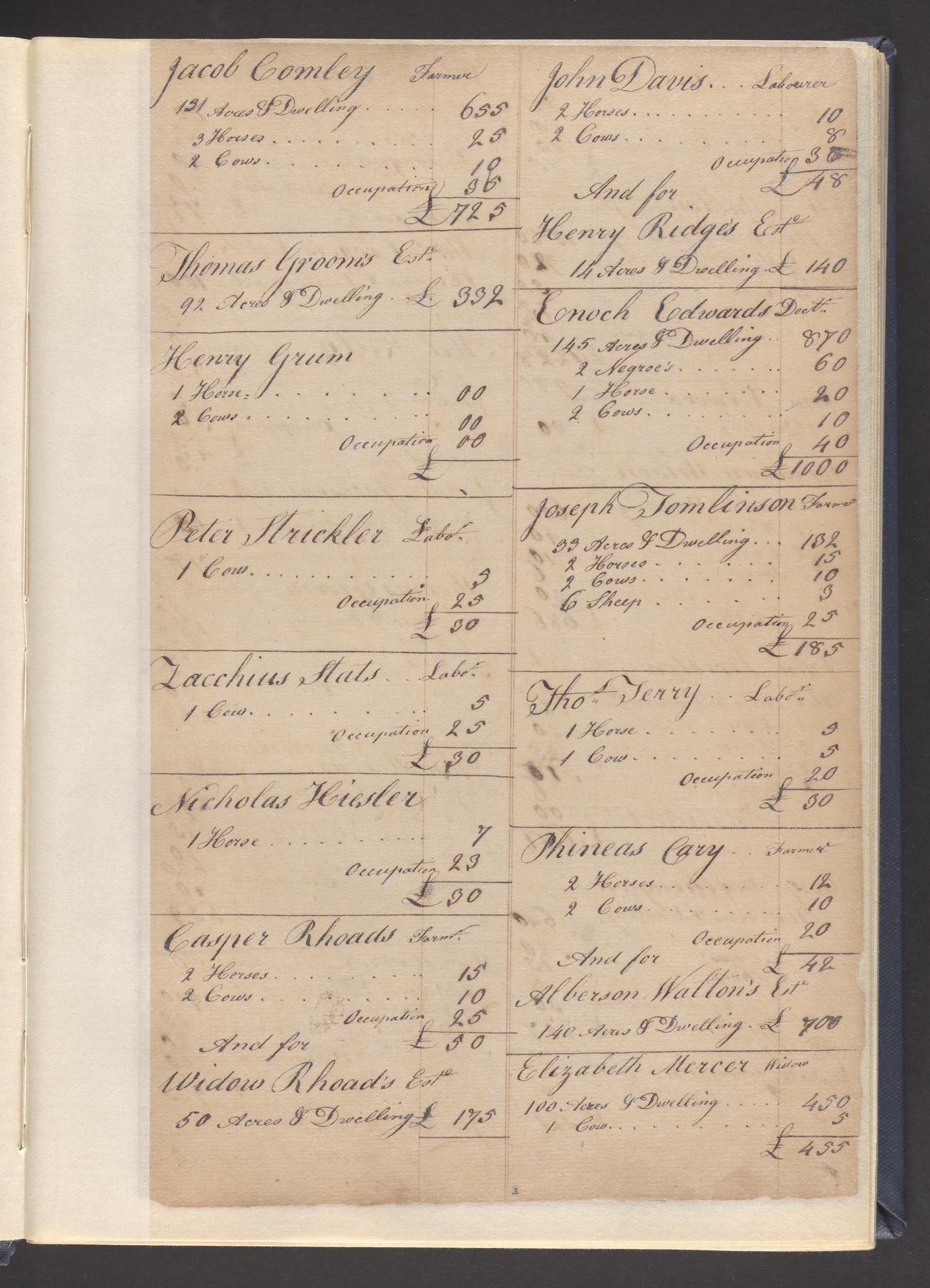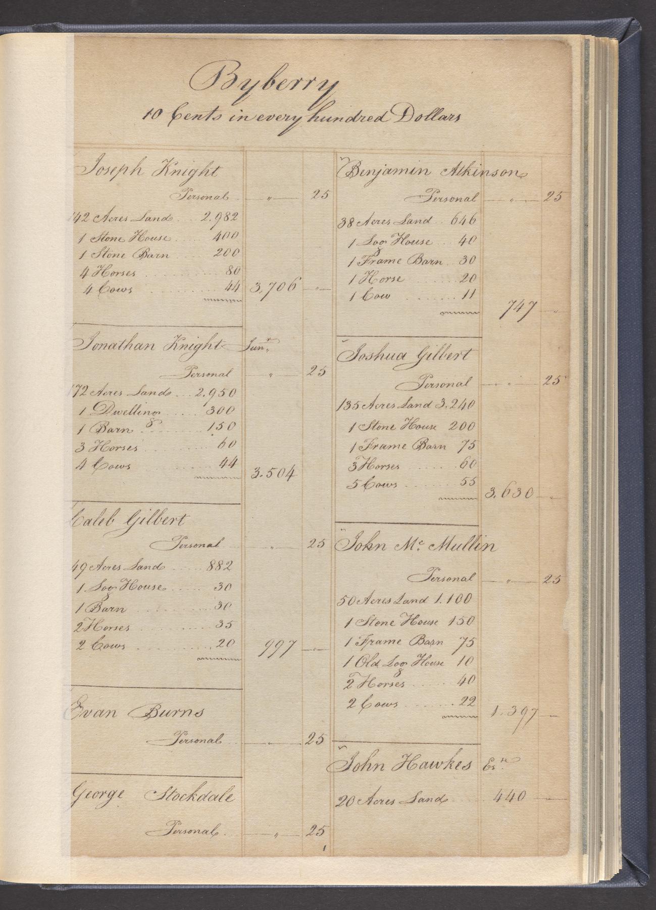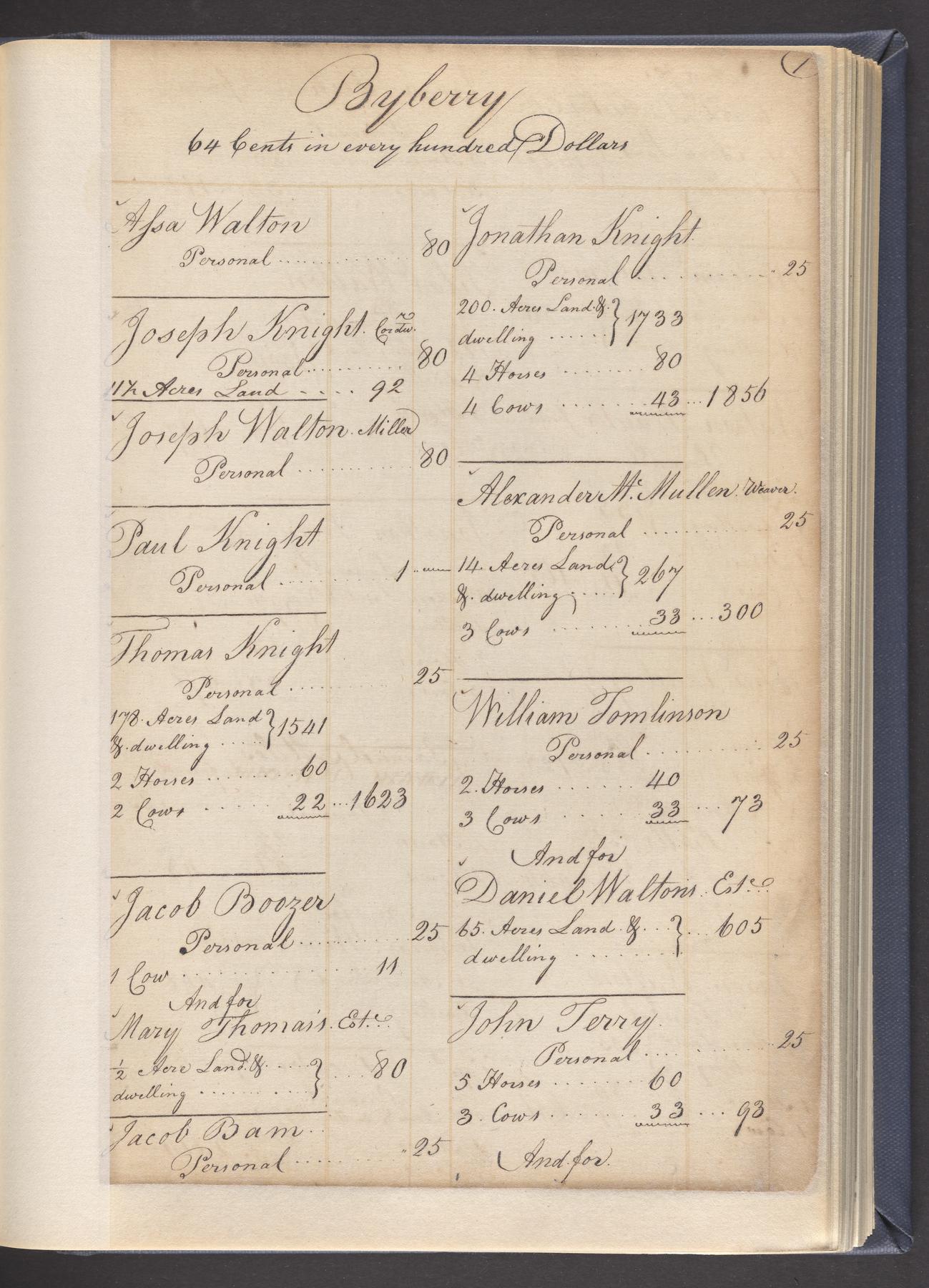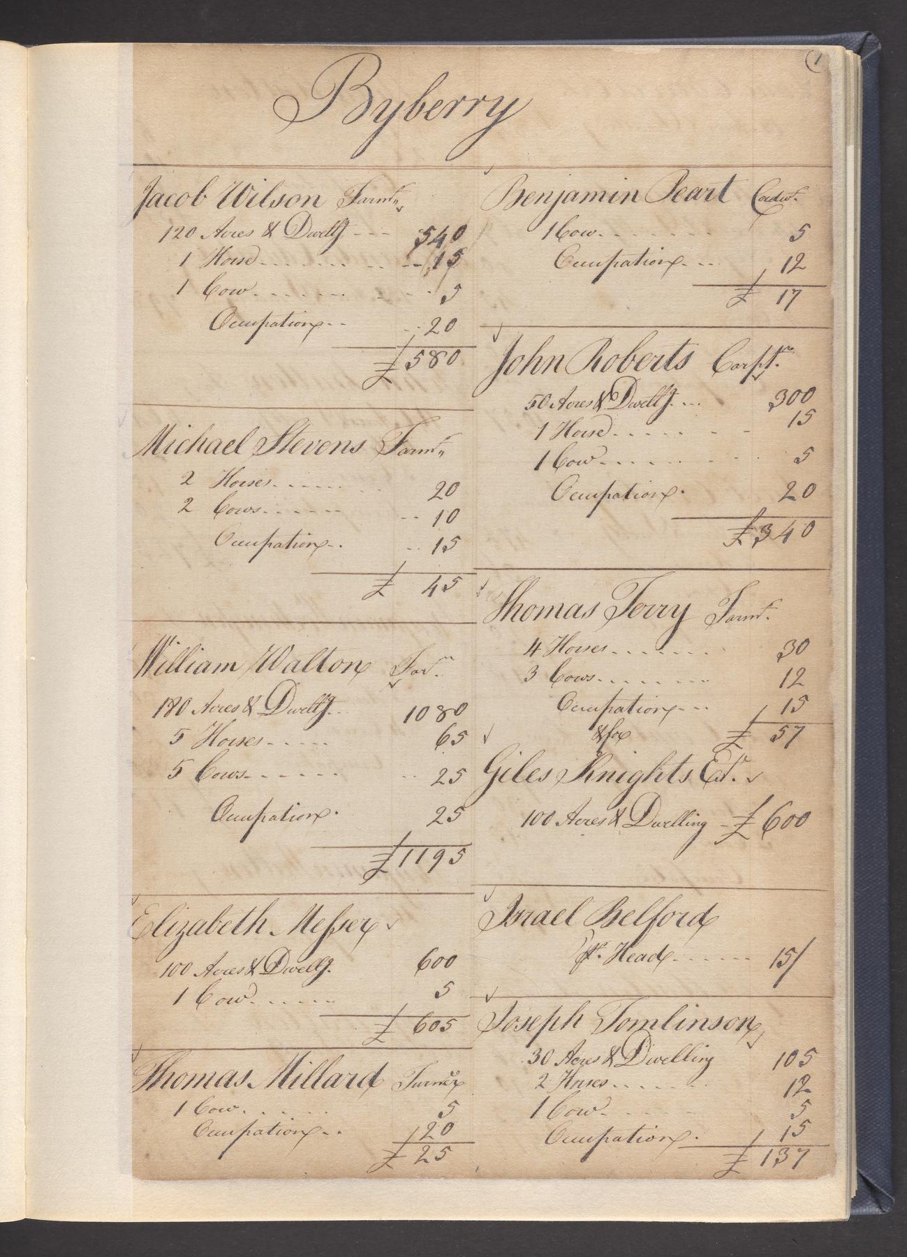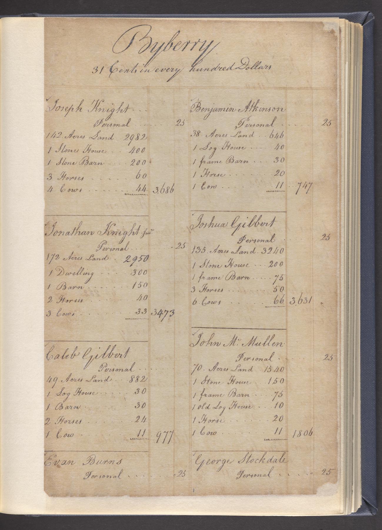 State tax assessment ledger for Byberry Township for 1783, 1785-1787. Lists taxable's name, occupation, list of property taxed (chiefly, real estate but some entries include personal property) and assessed value. County tax assessment ledgers for Byberry Township for 1797-1803, which list the taxable's name, and occasionally occupation; total assessed value of property and total tax only.