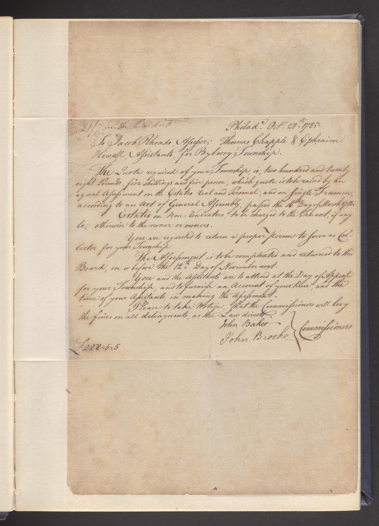 State and County tax assessment ledger, Byberry TownshipCall number