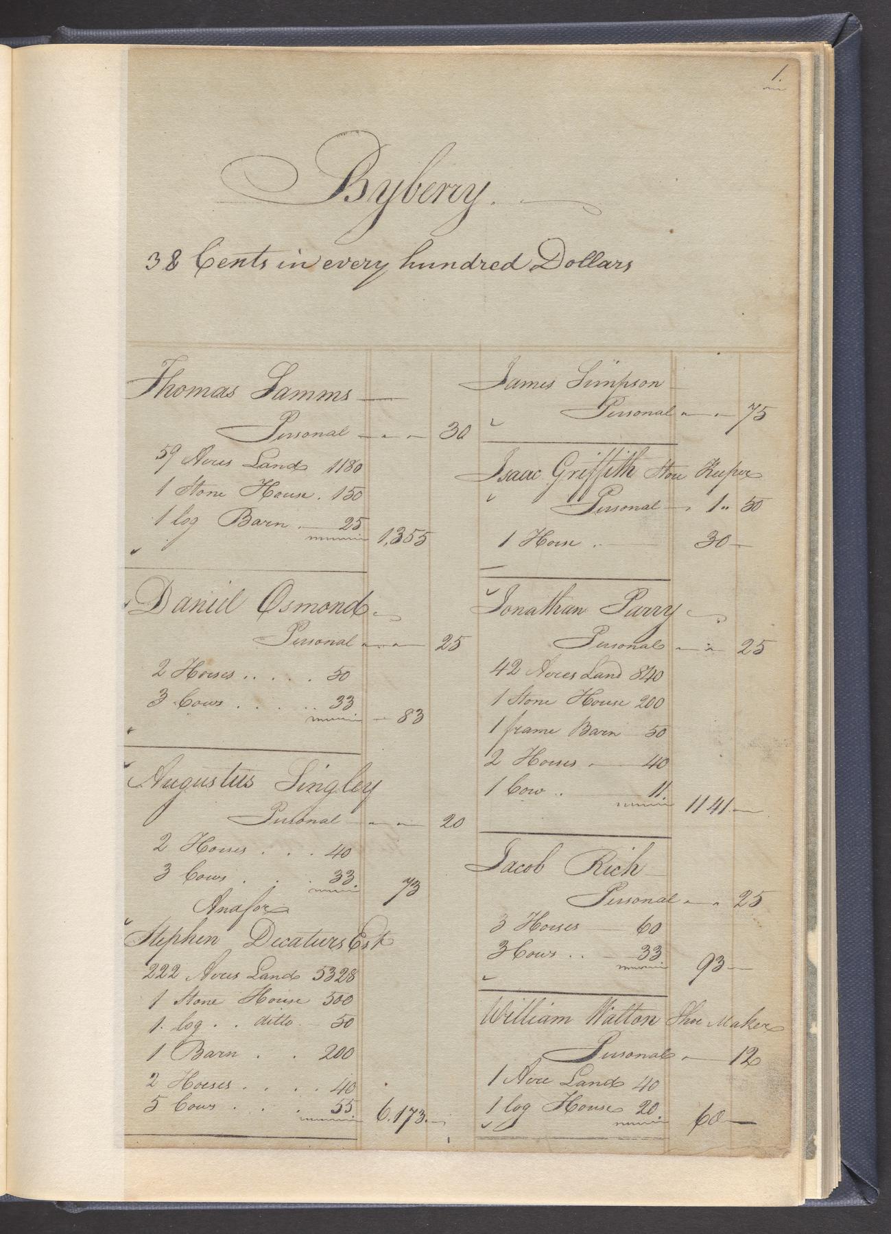 - To the extent possible under law, Philadelphia City Archives has waived all copyright and related or neighboring rights to these images and the content of Philadelphia City Archives RG1.8/1.9: TX 19: State and County tax assessment ledger, Byberry Township. This work is published from: United States. For a summary of CC0, see https://creativecommons.org/publicdomain/zero/1.0/. Legal code: https://creativecommons.org/publicdomain/zero/1.0/legalcode.